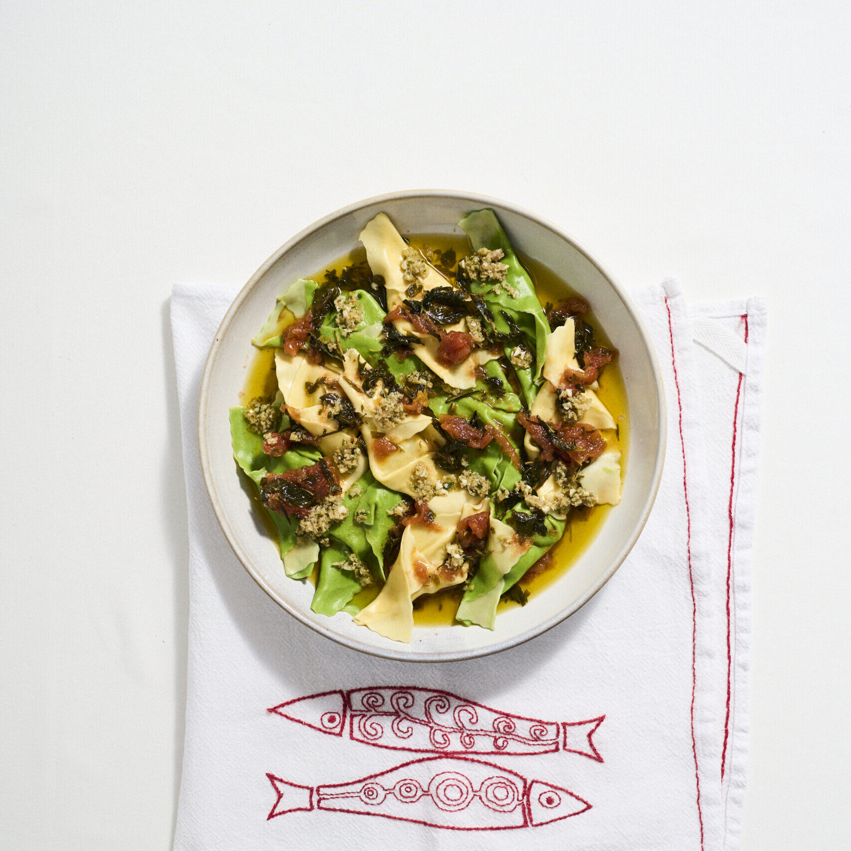 Massa delicada, com recheio leve e aromático de bacalhau, para servir como prato principal com nosso molho rústico de tomates frescos e mais pinceladas de tapenade de azeitonas verdes, com amêndoas e alcaparras.